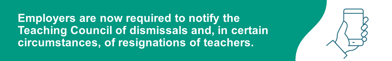 On 11 May 2023, the Minister for Education signed the Teaching Council (Information to be furnished by employer in case of dismissal or resignation of registered teacher) Regulations 2023. From 11 May 2023, employers must inform us when a teacher is dismissed or resigns following a complaint or disciplinary process at school level.