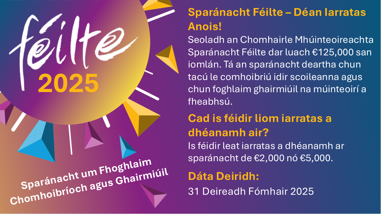 | Tacaíochtaí chun cabhrú leat iarratas a dhéanamh Chun tacú leat d’iarratas a chomhlánú, chruthaíomar Mol Féilte 2025 ar ár suíomh gréasáin ina bhfuil treoirlínte iarratais, taispeántas d’fhaighteoirí sparánachta roimhe seo agus rannóg ceisteanna coitianta. Beidh seimineár gréasáin faisnéiseach againn lena dtreoraítear tríd an bpróiseas iarratais ar sparánacht thú ar an 24 Meán Fómhair. Tá sonraí iomlána, lena n-áirítear conas clárú don seisiún ar fáil sa Mhol Féilte. |