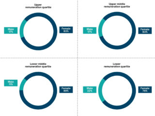A similar pattern appears across remuneration quartiles. Women make up 83% of employees in both the upper and upper-middle quartiles, 89% in the lower-middle quartile and 78% in the lower quartile. This demonstrates strong female representation across all levels of the organisation, including specialist and senior roles, and confirms that the gender pay gap is primarily the result of workforce composition rather than unequal pay.